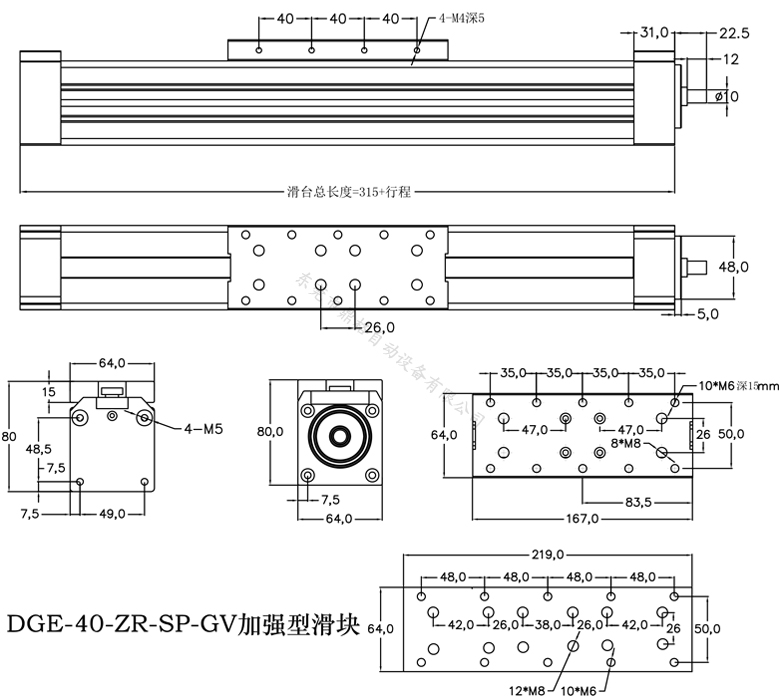 產(chǎn)品介紹 鼎格 DGE-40-ZR-SP全封閉-絲桿電動(dòng)滑臺(tái),缸筒型材64*64mm,有效行程1-1000mm, 負(fù)載能力1-30kg,重復(fù)定位精度±0.02mm,最高速度1000mm/s(加減速時(shí)間 0.2秒-0.4秒),絲桿等級(jí)C7/C5,螺桿直徑16mm,螺桿導(dǎo)程5mm/10mm/20mm,絲桿出軸10mm,總長(zhǎng)度=有效行程+315mm,重量KG=6.29+1.05×行程(如行程1000mm=1.05×10)+1.82+0.82,相關(guān)配件:上銀直線導(dǎo)軌,TBI滾珠絲桿,可以單軸使用也可以多軸組使用,可根據(jù)客戶行程要求設(shè)計(jì)定制.