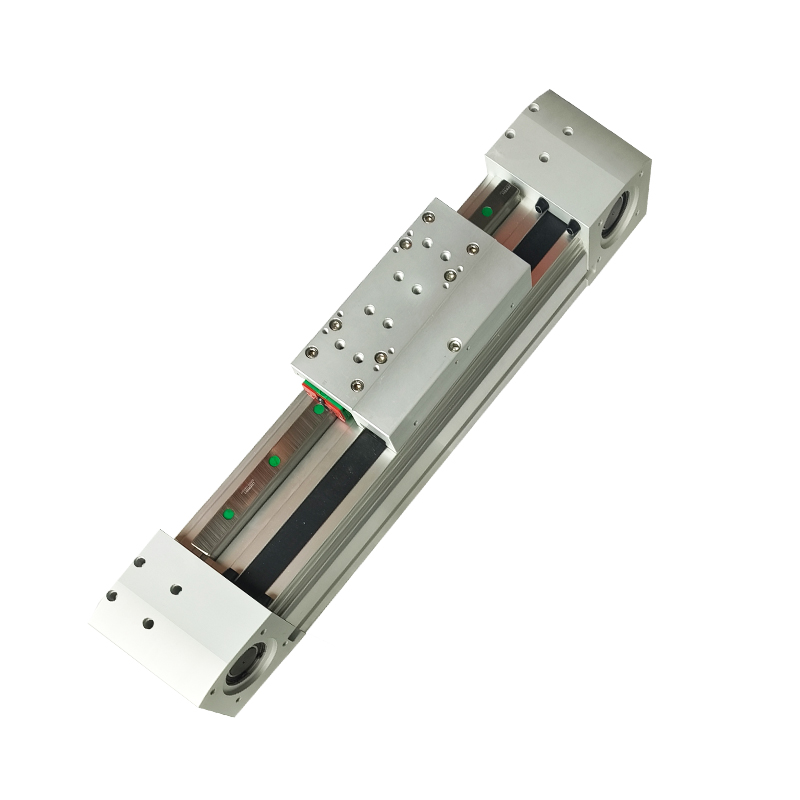 鼎格同步帶直線模組的運行依賴一套精密傳動機制。動力源一般為伺服電機或步進電機,電機運轉(zhuǎn)帶動主動輪旋轉(zhuǎn)。同步帶內(nèi)表面有特定齒形,與主動輪及從動輪的齒槽精準嚙合,從而將電機的旋轉(zhuǎn)運動平穩(wěn)轉(zhuǎn)化為直線運動。在同步帶特定位置固定有滑塊,負載安裝于滑塊之上,當同步帶移動時,滑塊及負載隨之做直線位移,實現(xiàn)精準定位與直線輸送。為保證同步帶始終處于最佳工作狀態(tài),模組配備了張力調(diào)節(jié)裝置,通過調(diào)整同步帶松緊度,防止出現(xiàn)打滑現(xiàn)象,確保動力傳輸?shù)姆€(wěn)定性與準確性,使整個系統(tǒng)能夠持續(xù)、可靠運行。例如,在電子元器件貼片環(huán)節(jié),電機驅(qū)動主動輪,經(jīng)同步帶帶動滑塊上的貼裝頭精準移動到指定位置進行貼片操作